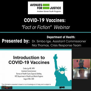 With more of our young people gearing up to return to our centers for Fall programming and heading back to school, Avenues for Justice held an emergency webinar titled “Facts and Fiction” for our staff, participants, and their families. The workshop was led by Dr. Simbo Ige, Assistant Commissioner, and Nia Thomas, Crisis Response Team, both from the NYC Department of Health and Mental Hygiene (DOHMH).